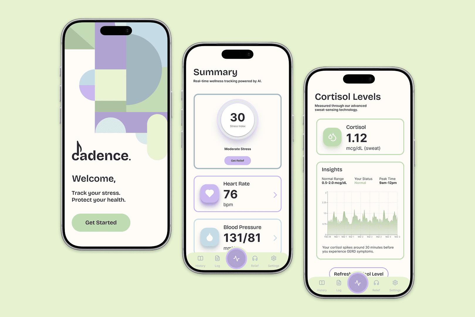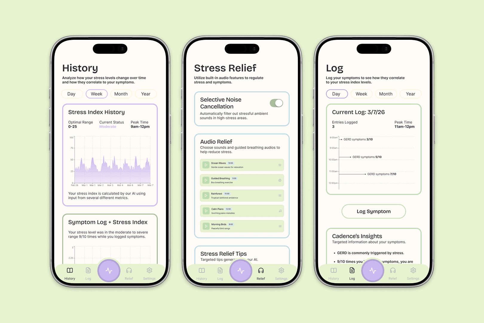 Keeping this in mind, we designed Cadence to target users aged 18-35 with one or more health conditions that are worsened by stress. We want to help users understand what triggers their stress, how their stress relates to their medical symptoms, and what simple solutions can be implemented to help users get relief.
