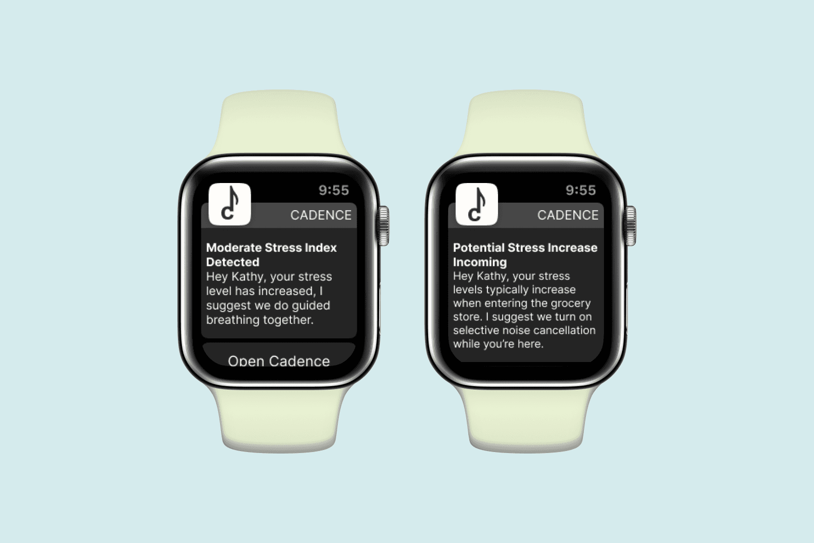 Scenario: User allows Cadence AI to track metrics through fitness wearables, Cadence Patch, smartphone, and active noise cancellation headphones/earbuds. User doesn’t log health symptoms often, as they have no chronic health conditions. Cadence AI analyzes tracked metrics and the occasional health symptom log. Cadence AI informs the user that they experience high stress while on their commute to work on the train and while in the grocery store because of the ambient noise levels. Cadence AI sends the user notifications before they enter these areas, prompting them to turn on selective noise cancellation. The user turns on selective noise cancellation, and they experience a better commute and shopping experience. User becomes more aware of what triggers stress for them.